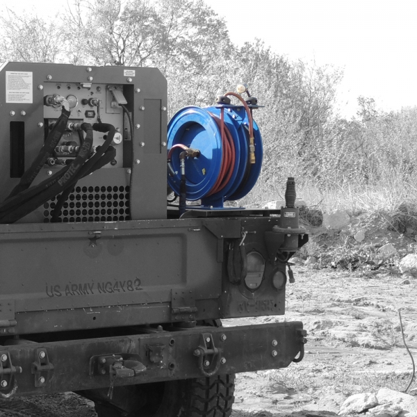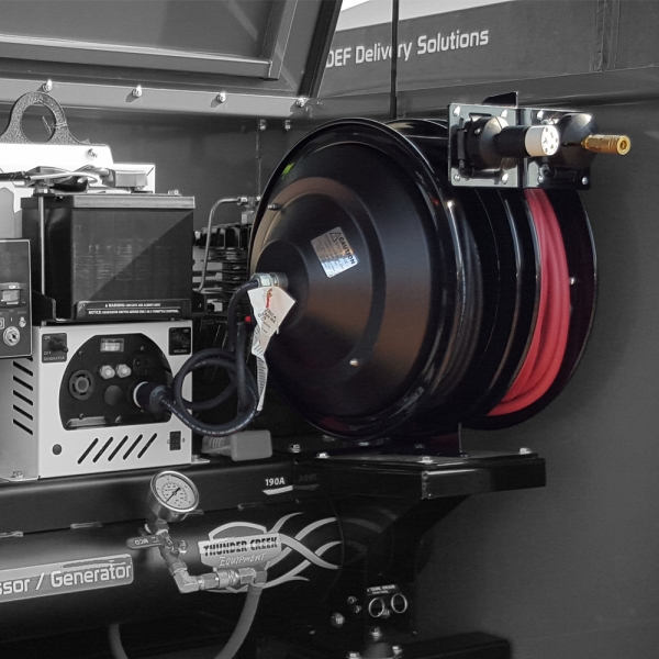 - Compact two reel assembly for dual hose applications, each reel operates independently
