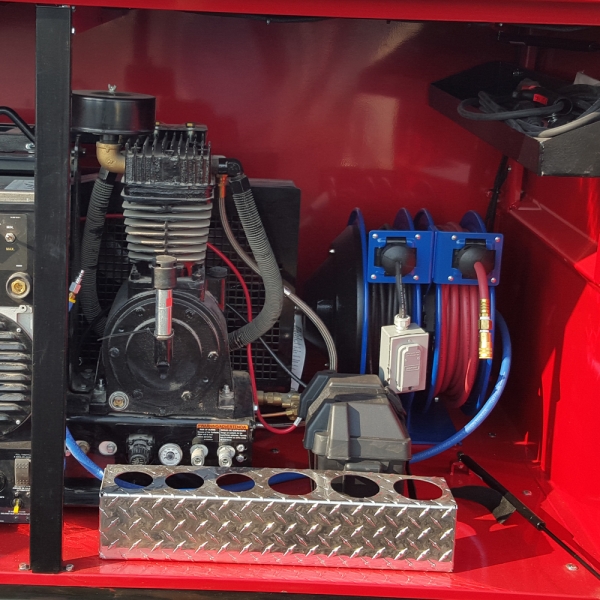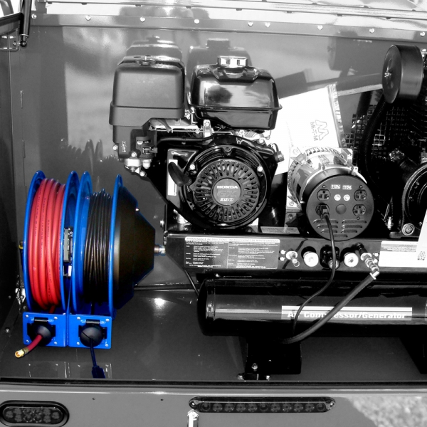 - 1/4" STEEL BASE - Sturdy single expanded pedestal design with solid one piece steel base and support post, no weld, for maximum stability. Compact two reel assembly for air/ electric applications, each reel operates independently.