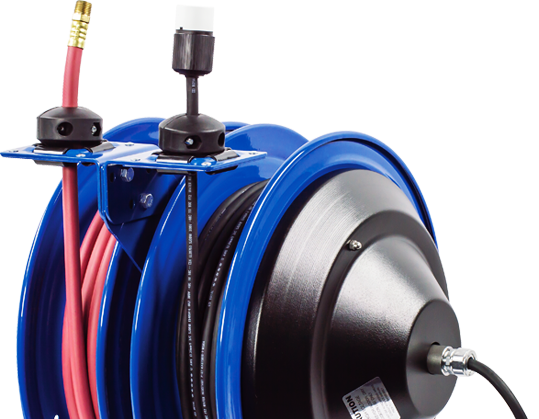 - OTHER FEATURES INCLUDE - long lasting, chip resistant and rust inhibiting CPC powder coat finish, adjustable solid rubber hose stop, sturdy permanently lubricated precision bearings, 5' lead cable and grounding plug, and single industrial receptacle.