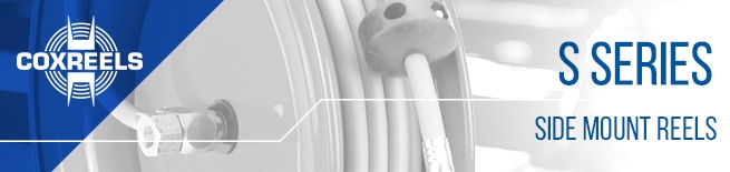 COXREELS® S Series " Side Mount" spring driven hose reels for cabinet mount are compact, versatile and unique in the way they mount and operate. They feature a simple two-bolt mounting pattern for easy installation and detachment for multiple workstation applications. S Series is available for air/water, oil, grease, oxy-acetylene and T Grade gas welding hose. The 360° hose direction allows the user to operate the reel in any direction the job demands. Common applications include service units, tool benches, tool boxes, vertical walls and beams, vehicle lift systems, machine tools, service vehicles or any flat vertical surface.